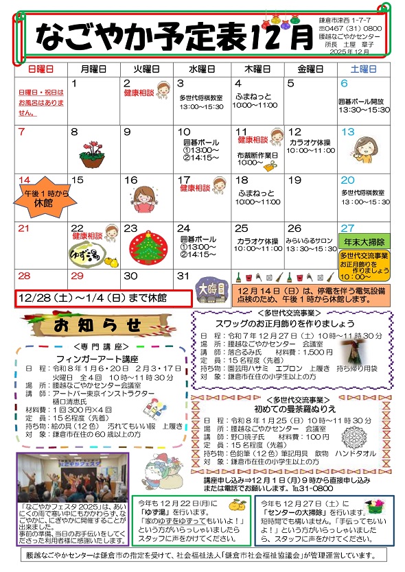 腰越なごやかセンターは鎌倉市の指定を受けて、社会福祉法人「鎌倉市社会福祉協議会」が管理運営しています。