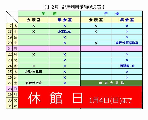 年末年始は12月28日(日)より1月4日(日)まで休館日となります。