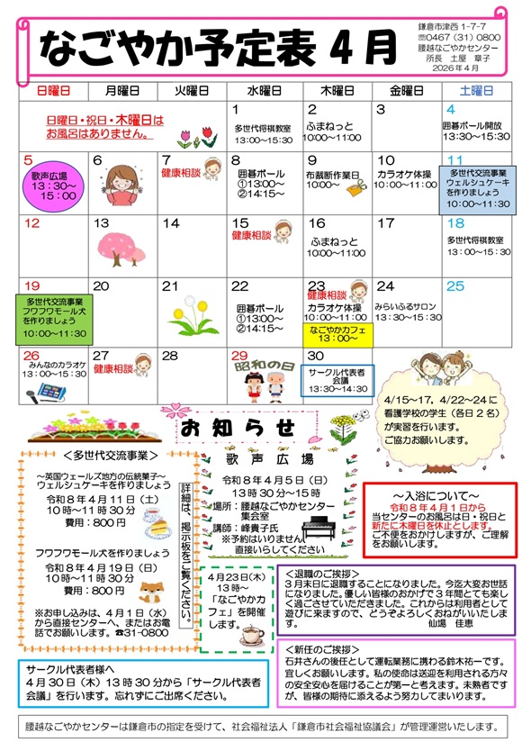 河津桜・玉縄桜からソメイヨシノへと主役の座が移り、サクラを取り巻く色とりどりの草花との競演劇『四季〜第一部・春爛漫〜』の幕開けです。新しい四季の始まりは新たに何かを始めるにも絶好のタイミング、ちょっと気になるサークルや催し・集まりに一歩踏み出してみませんか。なごやかセンターでは、多くの方に参加してただけるようバラエティに富む企画で皆様をお待ちしています。