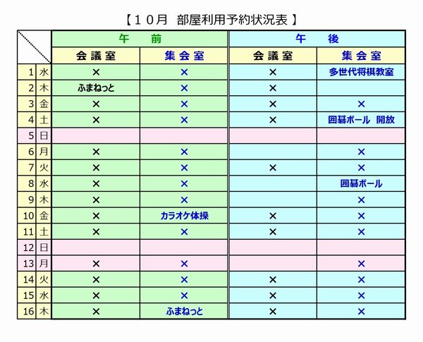 10月前半部屋利用予約状況表
